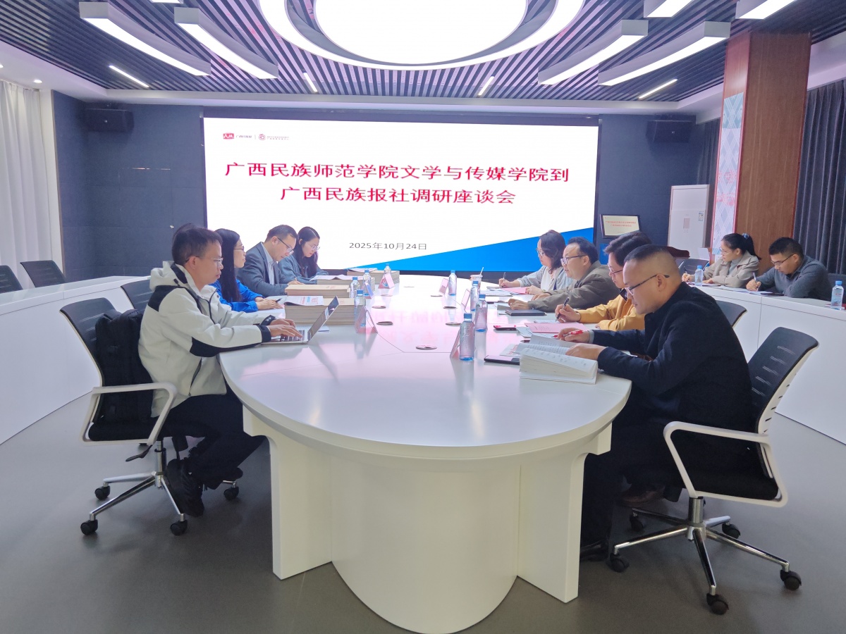 10月24日下午,广西民族师范学院文学与传媒学院民族文化教研团队在左江流域民族文化研究中心常务副主任谭群瑛教授的带领下,到广西民族报社就有关校本教材编纂工作开展调研交流。双方围绕教材框架设计、文章筛选标准、版权使用授权、内容教学适配性以及壮语文传播实践等方面进行了深入探讨,并就建立常态化交流机制、深化后续合作等达成共识。