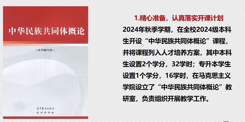 2024年秋季学期起,该校为全体本科生开设《中华民族共同体概论》课程,将该课程纳入人才培养方案,构建起常态化的共同体意识教育体系,在广西高校中先行一步。马克思主义学院同步成立专项教研室,统筹教学研究、师资培训等工作。同时,将“铸牢”要求有机融入思政课教学,帮助学生树立正确的国家观、历史观、民族观、文化观、宗教观,大力弘扬中华优秀传统文化、革命文化和社会主义先进文化,增进对伟大祖国、中华民族、中华文化、中国共产党、中国特色社会主义的高度认同等,推动党的创新理论入脑入心。