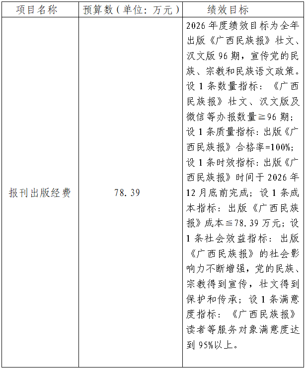 (一)我单位2026年所有项目支出全面实施绩效目标管理,涉及自治区本级项目6个,预算资金145万元;对下转移支付项目0个,预算资金0万元。绩效目标情况详见报表。