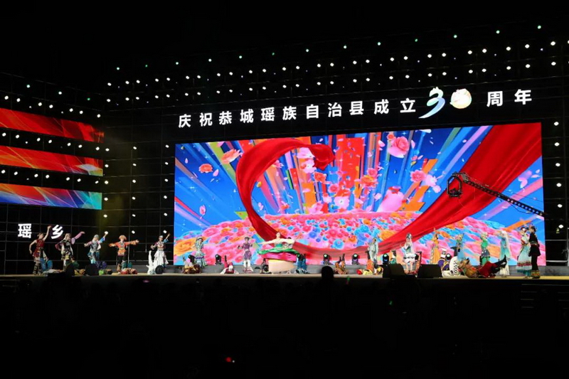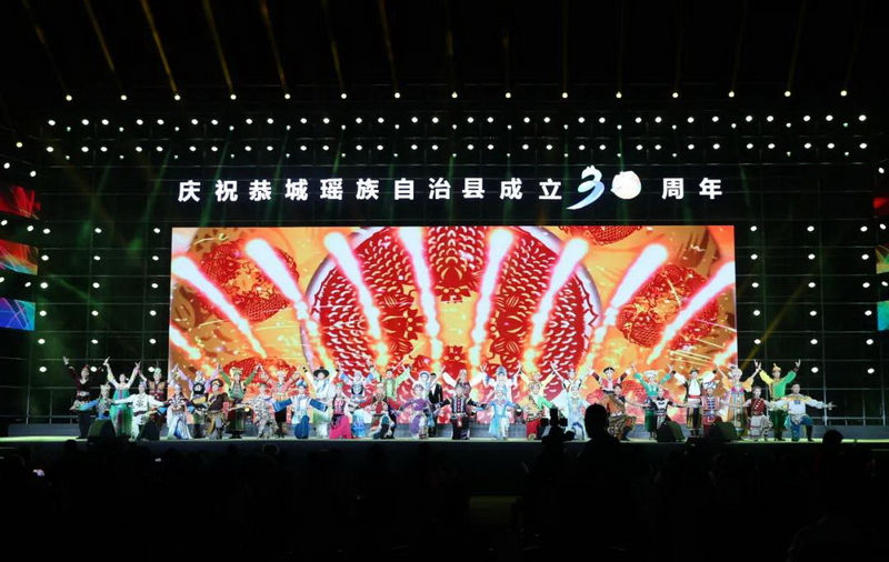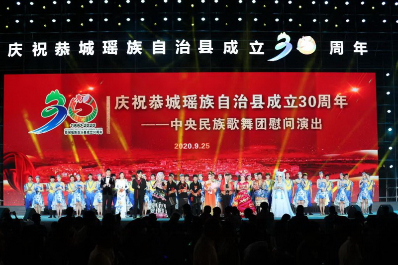 9月25日晚,中央民族歌舞团的艺术家们带着党中央、国务院对民族地区的关怀,带着全国各族人民的祝福来到该县,为瑶乡人民带来了一场美轮美奂的专场慰问演出活动。全国人大民委、国家民委祝贺团,区、市代表团,嘉宾,县四家班子领导及各族干部群众代表到晚会现场观看演出。