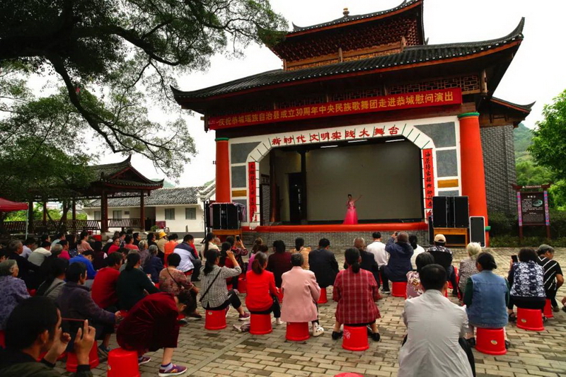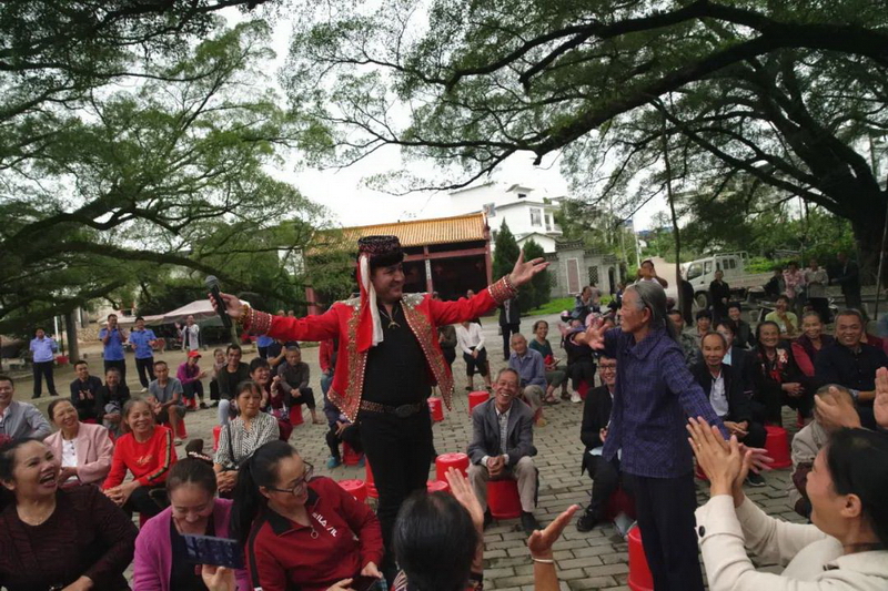 杨倩琳、阿旺·洛桑顿珠、李雪、阿洪尼克先后演唱了《花腰女》《打歌》《卓玛》《最美的歌儿唱给妈妈》《美丽神奇的地方》《桂美大地》《新疆民歌联唱》《欢乐的帕米尔》等多民族歌曲,魏彬琦表演了独舞《原上草》。演员们饱含真情的表演深深打动了现场村民,掌声和欢笑声飘荡在古老的榕树下。演出结束后,部分村民与演员们合影时,有村民还热情地拉着演员的手说:“中午到我家去吃饭吧!”