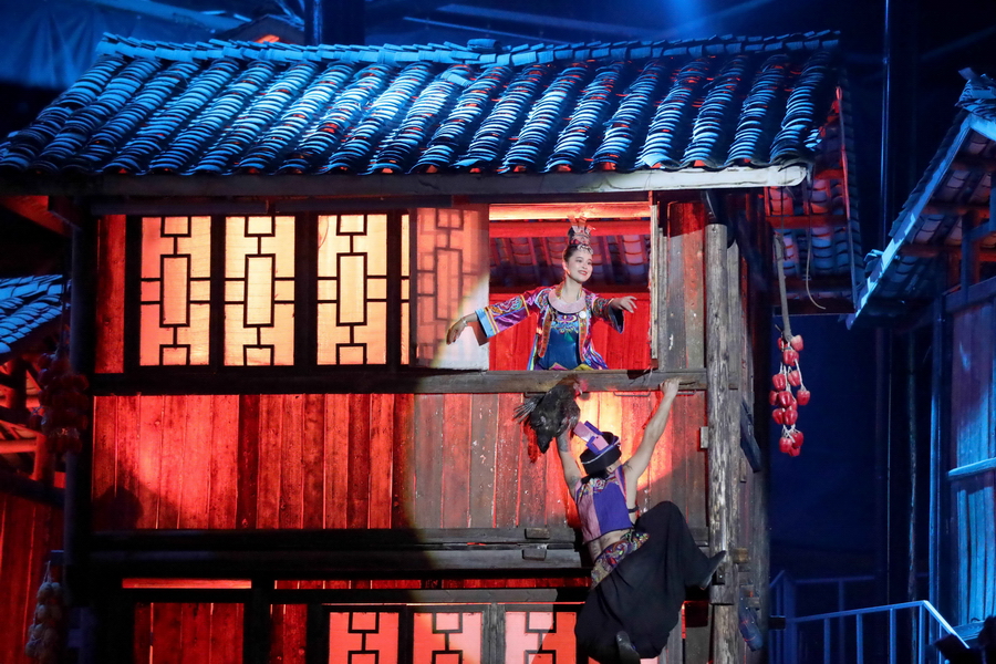 2月15日,演员们在三江侗族自治县侗乡鸟巢剧院表演《坐妹》。