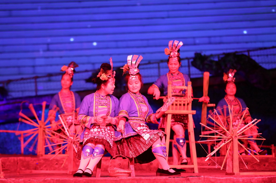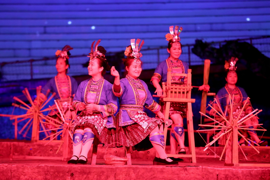 2月15日,在三江侗族自治县侗乡鸟巢剧院,演员们在绣鞋垫、纺纱。