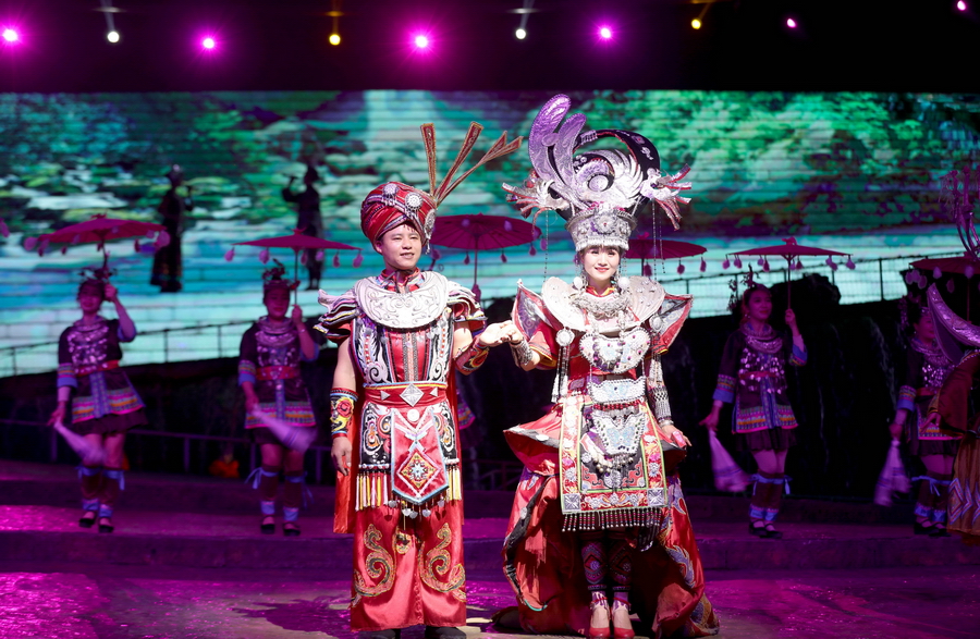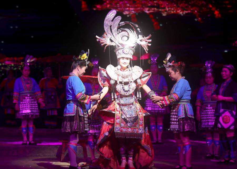 2月15日,在三江侗族自治县侗乡鸟巢剧院,演员们在表演送新娘。