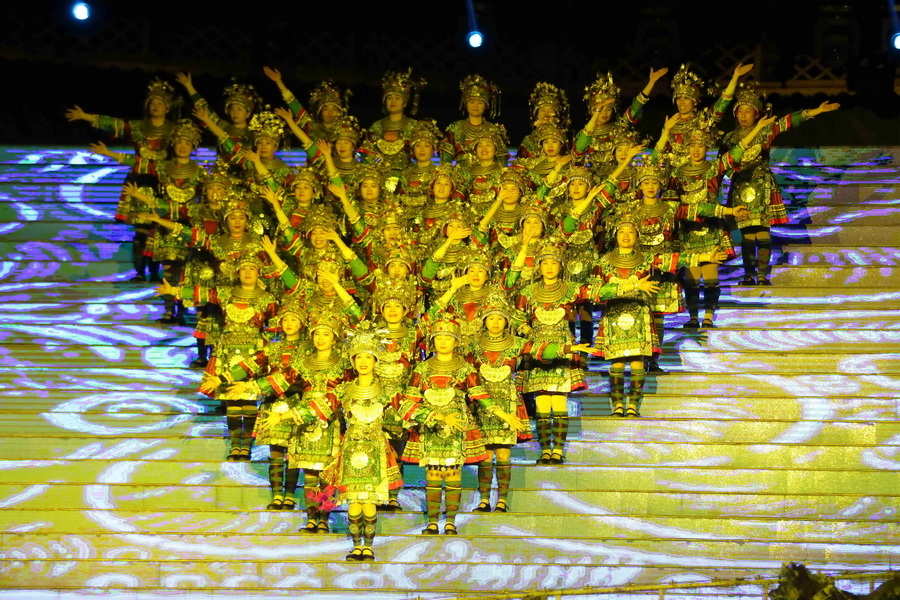 2月15日,在三江侗族自治县侗乡鸟巢剧院,演员们在表演银饰舞。