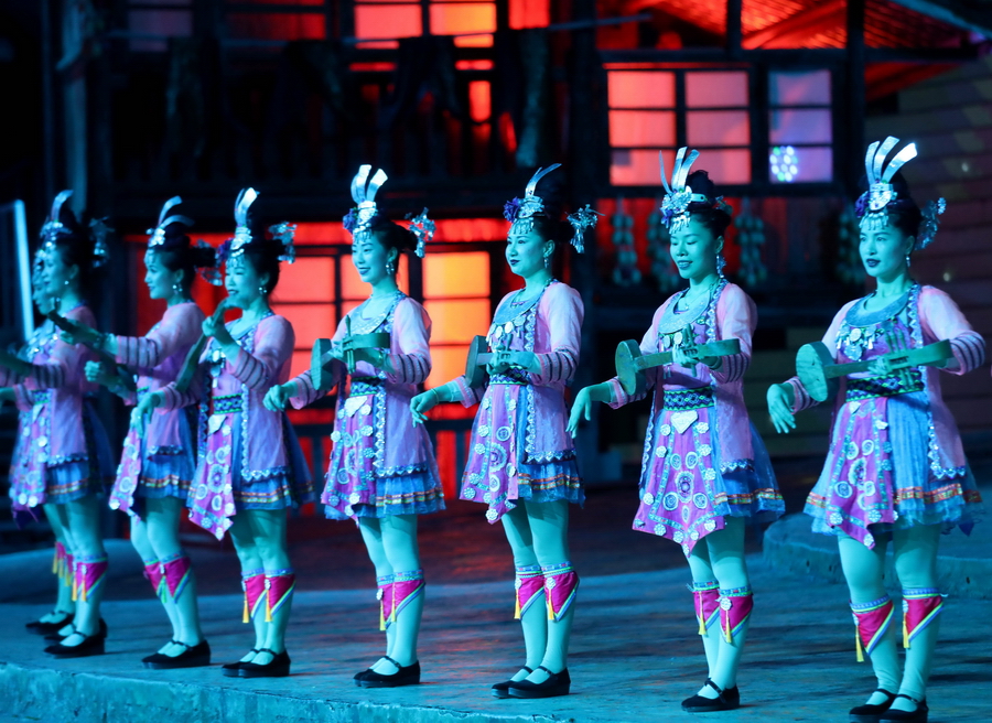2月15日,在三江侗族自治县侗乡鸟巢剧院,演员们在表演民族舞蹈。