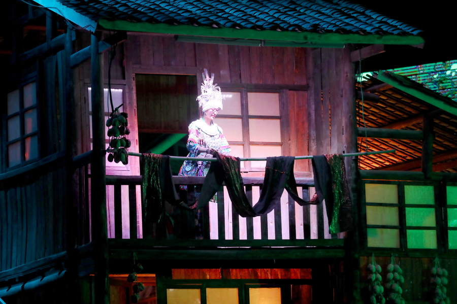 2月15日,在三江侗族自治县侗乡鸟巢剧院,一名演员在晾晒侗布。