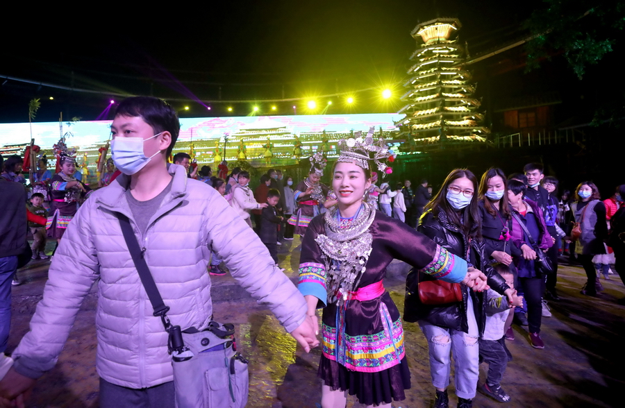 2月15日,在三江侗族自治县侗乡鸟巢剧院,游客们上台与演员多耶互动。