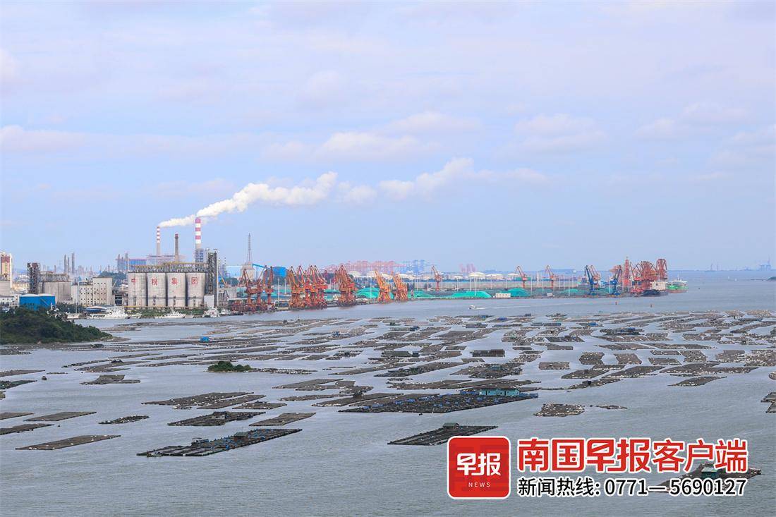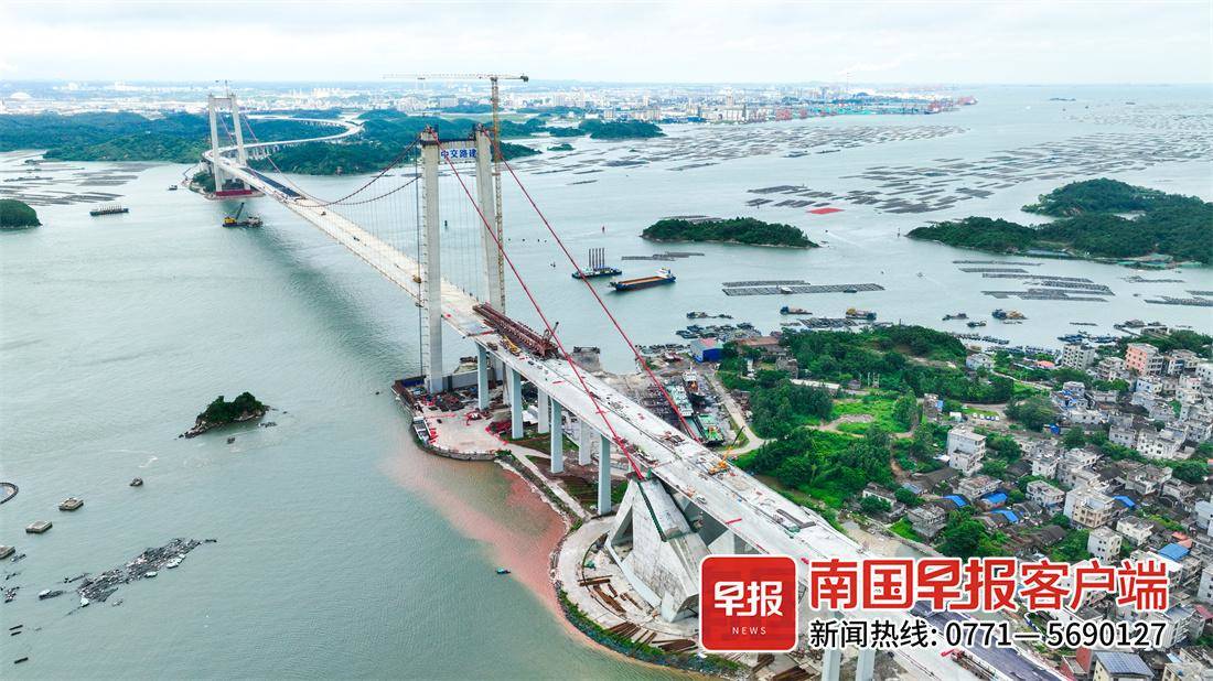 从青年枢纽“一路向海”,就能到位于运河出海口的龙门大桥,这是广西在建的最长跨海大桥,也是广西首座跨径超千米的跨海悬索桥。记者在施工现场看到,大桥已经实现全线贯通,站在桥上望去是海天一色的壮阔景色,不远处的钦州港码头上,龙门吊正在紧张作业。