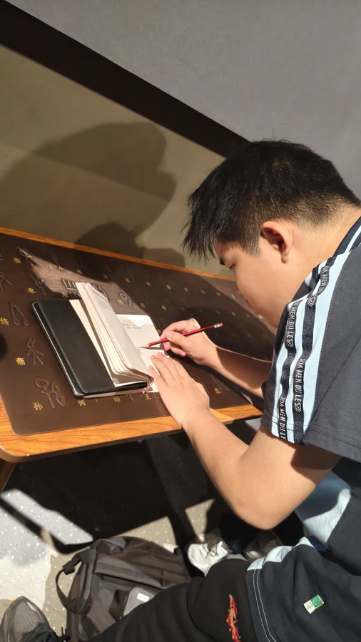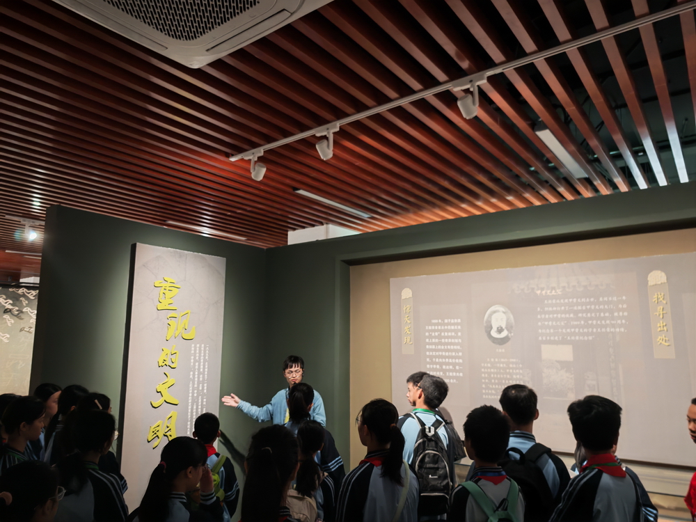 步入展厅,从中国发现年代最早、体系最为完整的成熟文字系统——甲骨文开始,到生动还原汉代戍边吏卒工作生活全景的居延汉简,一件件珍贵的文物文献静静陈列,将中华千年文明的脉络清晰铺展在学生眼前。学生们紧随讲解老师的步伐,时而驻足凝视文物上的细微刻痕,时而俯身记录甲骨文的演变轨迹,在探究学习中理清了汉字从甲骨文到现代汉字的发展脉络。