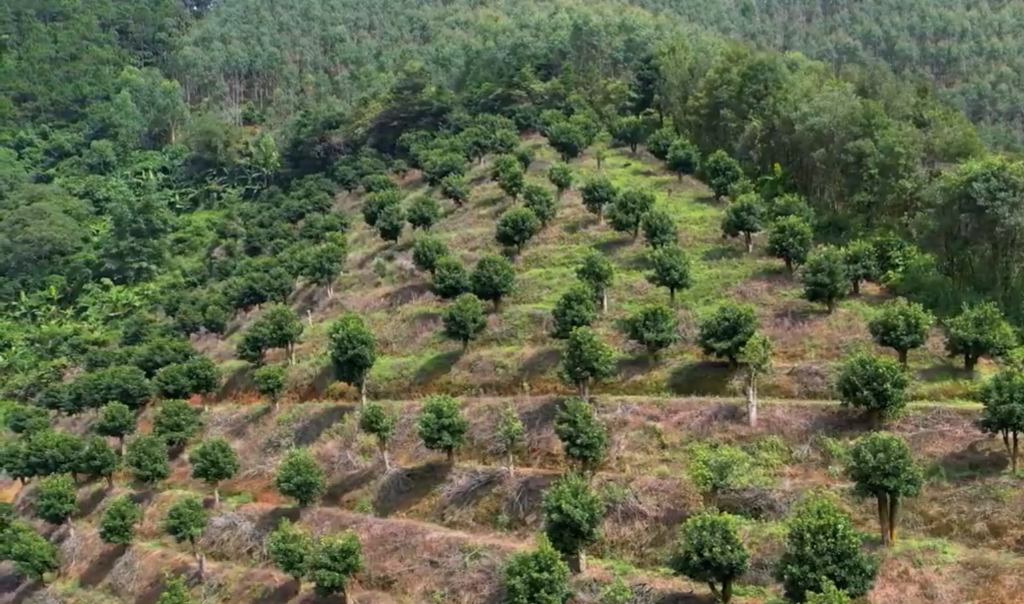初冬时节,广西国有七坡林场连片树林依山就势、起伏交错,一颗颗桉树直立挺拔,红椎、格木、米老排等多个乡土珍贵树种间栽其中,整片山林枝繁叶茂、被管护得井井有条。