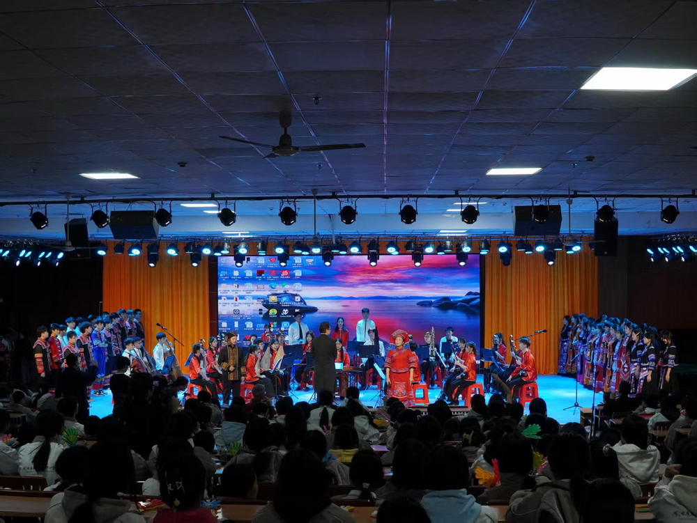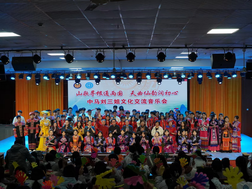文化交融,心灵共振。中马文化交流环节是此次交流的高光时刻。在河池市职业教育中心学校演艺厅内,两校师生围绕刘三姐山歌展开联合排练,清亮高亢与婉转悠扬的歌声交织,传递共同热爱刘三姐文化的情怀。18日上午,“山歌寻根通两国 天曲仙韵润初心——中马刘三姐文化音乐交流会”如期举行,400余名师生到场观看。两国青少年同台献艺,用乐器与歌声致敬经典,一首首刘三姐经典歌曲赢得全场师生的阵阵掌声,将文化共鸣推向高潮。