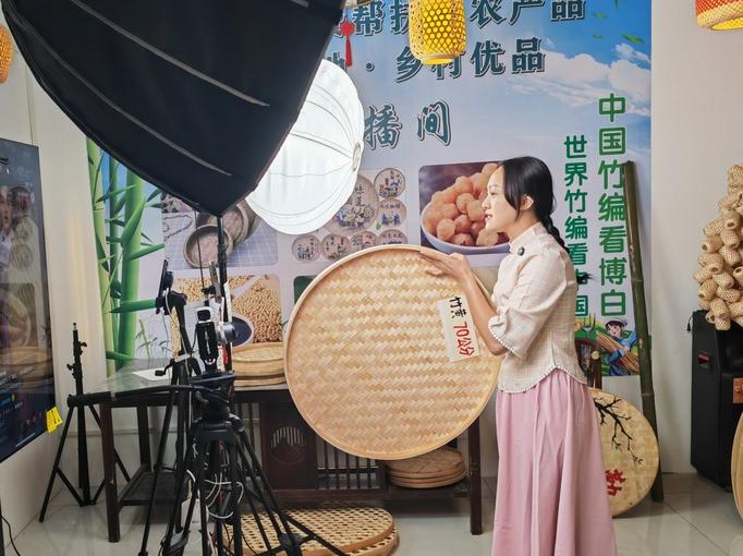 在广西博白县亚山镇和平村平辽坡屯,主播在直播推介非遗竹编产品。新华每日电讯记者何伟 摄