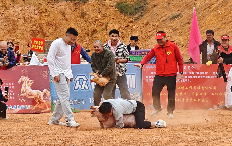 “抓龙猪”趣味竞技现场,选手扑倒抓住福猪,引得围观群众阵阵欢笑。韦子明摄