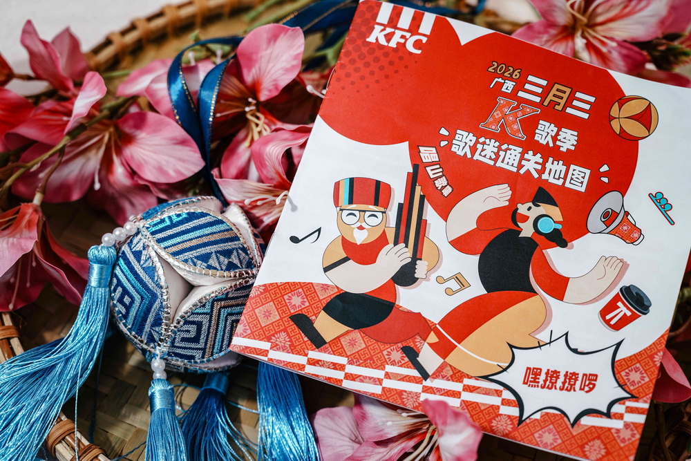 这个“三月三”,南宁的中山路美食街、水街历史文化街区、三街两巷历史文化街区和民歌湖广西三月三·八桂嘉年华主会场,将充满音乐与节庆律动。漫步中山路,肯德基竹编的“K歌季”打卡墙与街道两侧的热闹摊贩相映成趣;从水街餐厅凝望窗外的仓西门,感受传统与现代在玻璃光影间对话;三街两巷的青砖黛瓦旁,肯德基的橱窗内关于广西三月三的文化介绍正向大家讲述广西多彩的民歌文化;而位于民歌湖广西三月三八桂嘉年华主会场的快闪展位,也成为叶脉广场亮丽的风景线。