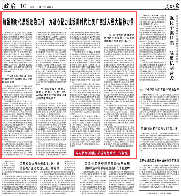 新闻眼12月17日,《人民日报》刊发广西壮族自治区党委书记陈刚署名文章《加强新时代思想政治工作 为凝心聚力建设新时代壮美广西注入强大精神力量》,全文如下——
