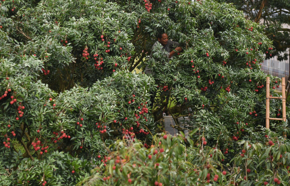 果农在广东茂名高州名园生态园采摘荔枝(2025年6月4日摄)。新华社记者邓华摄