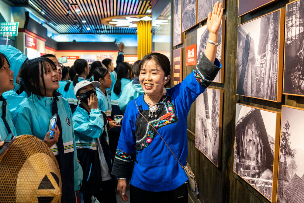 在湖南湘西十八洞村,讲解员施艳琴为游客讲解十八洞村的故事(2023年11月1日摄)。新华社记者陈思汗摄