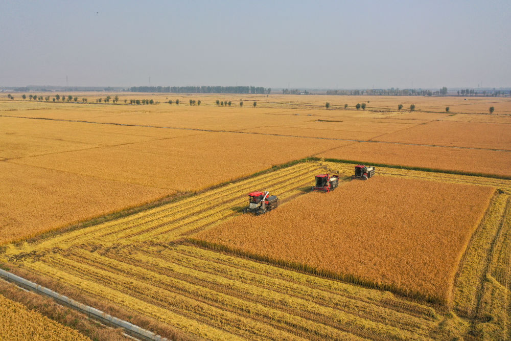 在吉林省公主岭市,吉林省米兜种植农民专业合作社进行机械化收割水稻作业展示(2025年10月14日摄,无人机照片)。新华社记者张楠摄