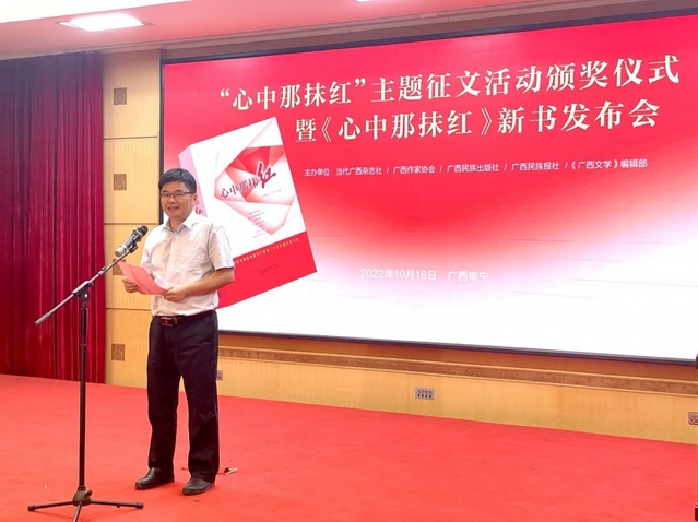 《心中那抹红》主编,广西文联党组成员、副主席石才夫在致辞中表示,在举世瞩目的党的二十大胜利召开、全国各族人民深入学习党的二十大精神之际,举办这次活动“正当其时,很有意义。”本次征文活动获奖作品紧紧围绕迎接党的二十大这条主线,聚焦八桂大地,以小见大,在有限的篇幅内,裁剪时代风云,描摹社会巨变,彰显奋斗之美,是一批主题鲜明、情感充沛、文字优美的优秀作品。“希望《心中那抹红》的出版发行,成为学习党的二十大精神热潮中的一朵浪花。”