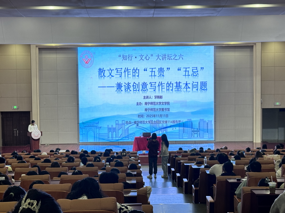 11月11日,南宁师范大学文学院与图书馆在五合校区联合举办了一场别开生面的文学交流活动——作家牙韩彰畅谈“散文写作的‘五贵’‘五忌’——兼谈创意写作的基本问题”。 讲座由文学院副院长、评论家张淑云教授主持,近300名师生现场听讲。