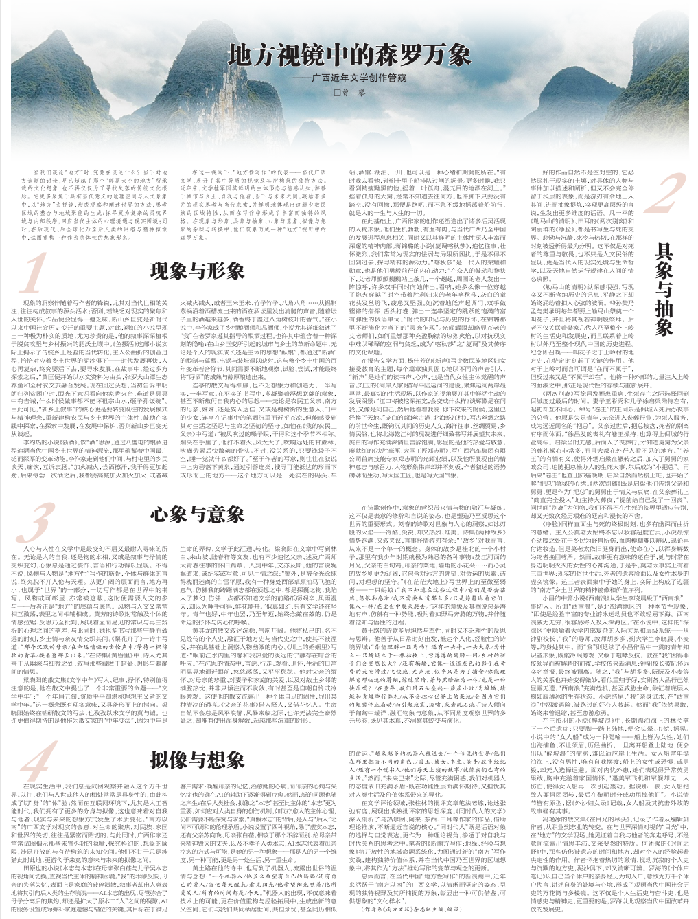 在这一视阈下,“地方性写作”的代表——当代广西文学,展开了其中异质的视镜及其所构筑的独特方法。近年来,文学桂军因其鲜明的主体形态与情感认知,游移于城市与乡土、自我与他者、当下与未来之间,凝结着多元的现实思考与当代求索,并鲜明地体现出边疆少数民族的区域特性,从而在写作中形成了丰富而独特的风格。在现象与形象、具象与抽象、心象与意象、拟像与想象的杂糅与转换中,他们筑累而成一种“地方”视野中的森罗万象。