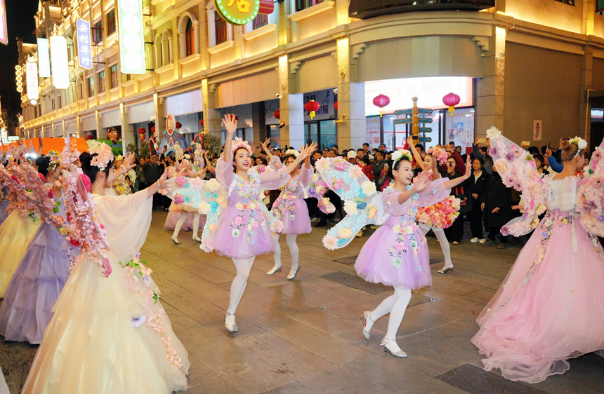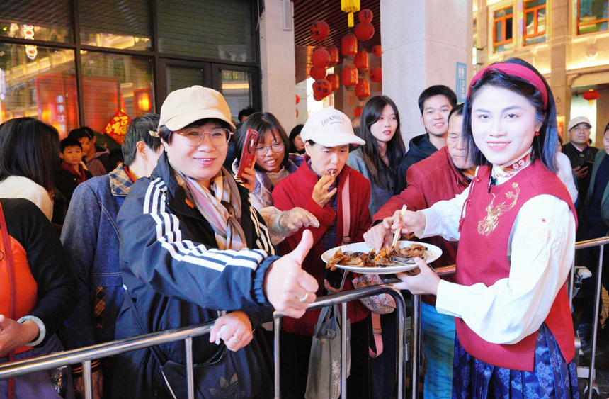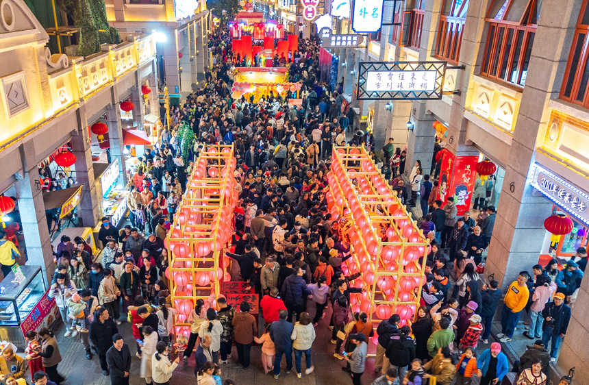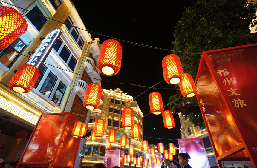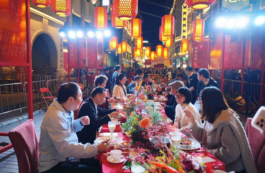 “‘梧’请客”元宵文旅团圆晚宴、“骑楼‘宵’遥游”街头光影巡游、“百事如意”灯谜会……2月12日晚,“喜乐梧州 梦幻良宵”上元团圆光影汇举行。活动现场人头攒动,热闹非凡,众多市民游客共同度过了一个难忘而充满非遗魅力的元宵佳节。(钟秋霞)