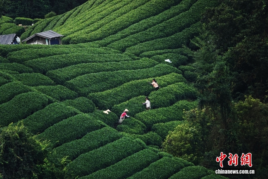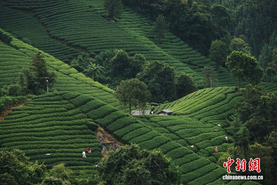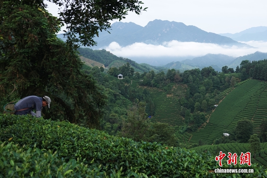 10月8日,寒露节气,广西贺州市昭平县20多万亩茶园进入最后一批秋茶采摘期,众多茶农上山赶采“寒露茶”。图为茶农在广西昭平县城郊外的高山生态茶园采摘寒露茶。