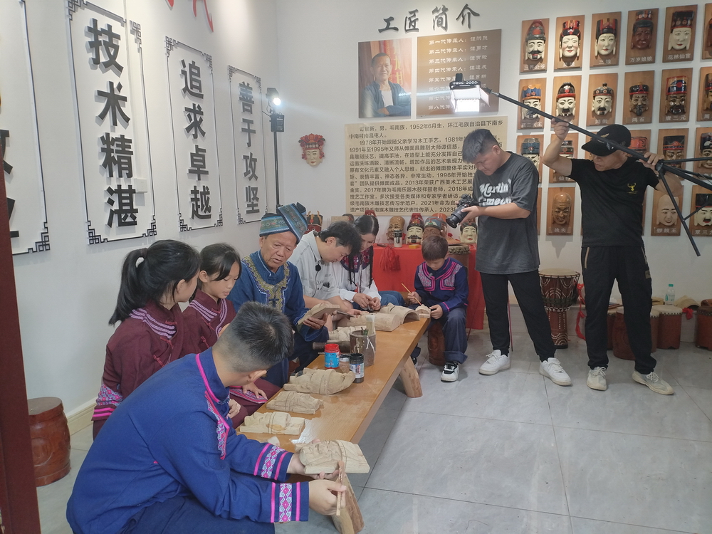 14日下午的毛南民族文化园和博物馆,成了孩子们的“文化乐园”。教育工委办特意协调博物馆开了“专场”,讲解员许阿姨指着展柜里的毛南族农耕工具,给孩子们讲:“这是以前阿公阿婆种稻子用的犁,现在咱们有收割机,但这工具里藏着毛南人勤劳的根。”小韦同学凑到玻璃前,指着一面老铜鼓问:“阿姨,这上面的花纹是画的‘蒲’(毛南语‘老虎’)吗?”逗得周围人都笑了。摄制组的镜头追着孩子们跑,记录下他们摸织锦时“哇,好软”的惊叹,听傩面传说时“原来它是用来祈福的”的点头,把这场“沉浸式对话”拍得满是温情。