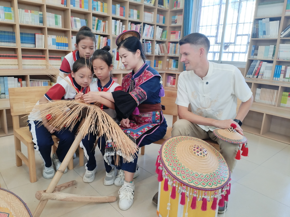 最暖的是16日午后,花竹帽非遗传承人谭汝老师背着竹篾进了校园。“先把竹丝泡软,编的时候要‘紧三松二’,像咱们毛南人过日子,张弛有度。”她握着小娃的手,手把手教编织,细薄的竹篾在一大一小指间翻飞,不一会儿就冒出花竹帽的尖儿。摄制组的镜头拉近,拍下竹篾上的光影,也拍下孩子们眼里的光——这是教育工委办特意协调的“非遗体验课”,要让孩子们亲手“织”出文化的根。