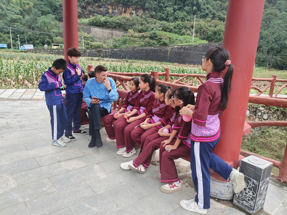“阿公讲的‘蒲’不可怕,我们唱歌把它赶跑!”15日的稻田边,毛南乐队的蒙娃努索蹲在田埂上,把《不怕大老虎》的歌词编成小故事。这位从下南乡走出去的毛南族姑娘,带着乐队伙伴李大为,扛着传统乐器来上课。一开始,孩子们觉得毛南语歌词“拗口”,蒙娃努索就把“阿妹”“阿公”换成同学的小名,“小谭你唱‘阿妹莫怕’,小覃你接‘我们唱歌’”,没一会儿,田埂上就响起此起彼伏的童声,连远处动车驶过的“呜呜”声,都被孩子们笑着录进手机,“这是家乡的新声音,要加到歌里!”