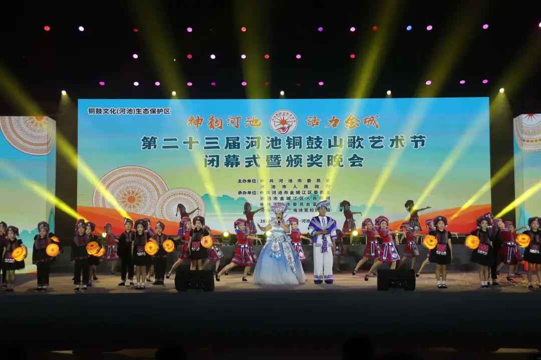 11月16日晚,第二十三届河池铜鼓山歌艺术节闭幕式暨颁奖晚会在河池市体育馆举行。