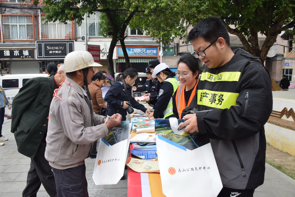 活动现场氛围浓烈,秩序井然。工作人员通过设立法规咨询台、展示典型案例、发放宣传材料等形式,向广大群众普及交通安全知识。活动中,马山公路养护中心职工化身“安全讲师”,不仅结合养护实际生动讲解了公路设施保护、路产路权知识及安全隐患防范等内容,还明确了群众遇到路边树木倒伏、路面落石等影响行车安全的突发险情时,应及时向马山公路养护中心报告,以便第一时间处置,保障路面安全畅通。此举有效引导群众自觉遵守法规,共同维护良好的公路安全秩序。活动累计发放《公路安全保护条例》《公路安全知识》等宣传手册250余份,小礼品120份,现场解答群众咨询120余人次。