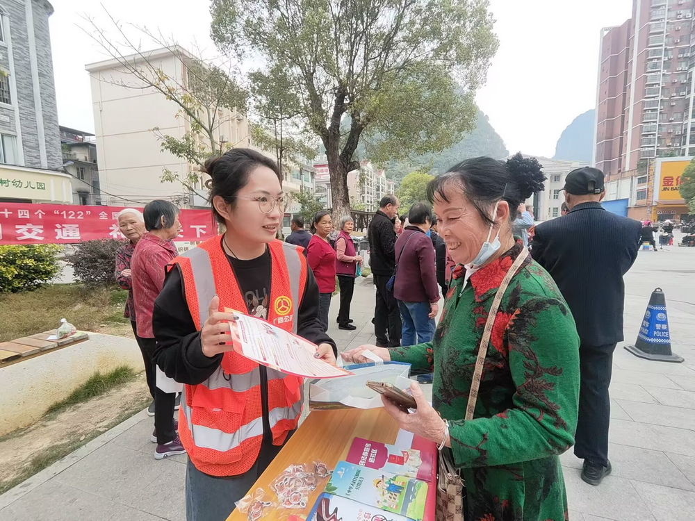 马山公路养护中心工作人员向群众发放知识手册。 岑佩娟 摄