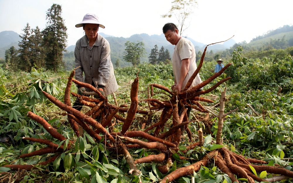2025年12月2日,广西来宾市忻城县城关镇高塘村农民在展示收获的黄心木薯。(樊绍光 摄)