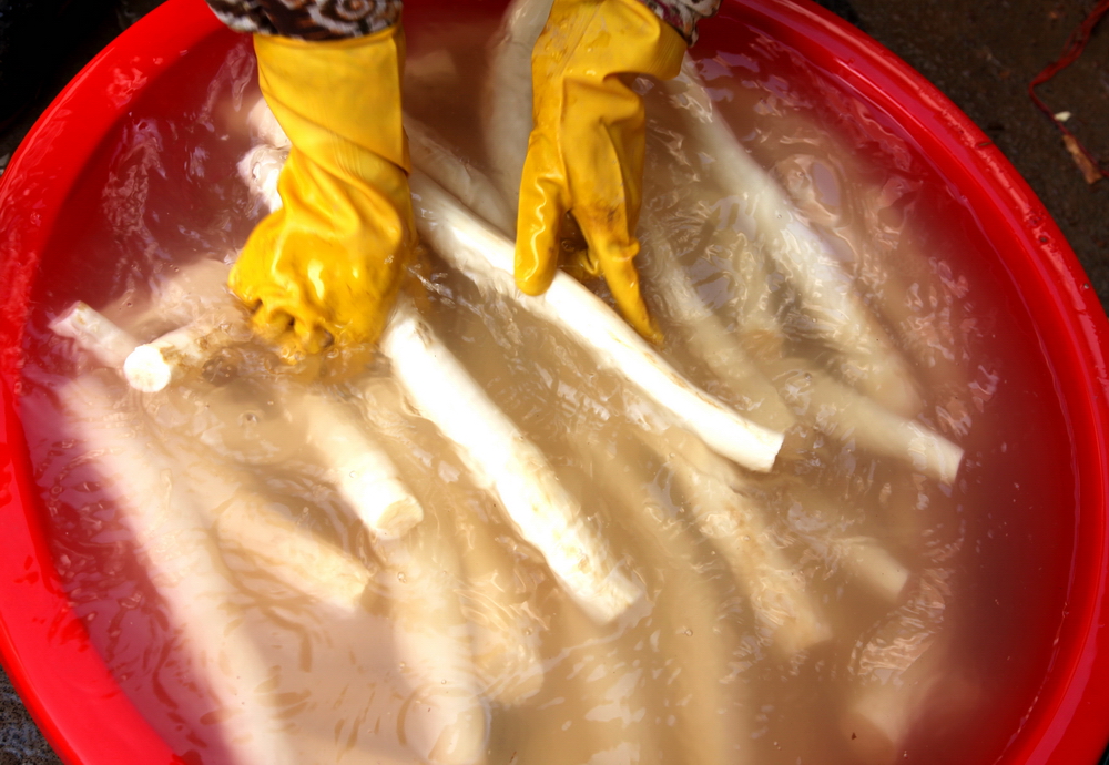 2025年12月2日,在广西来宾市忻城县城关镇高塘村,农民在清洗收获的黄心木薯。(樊绍光 摄)