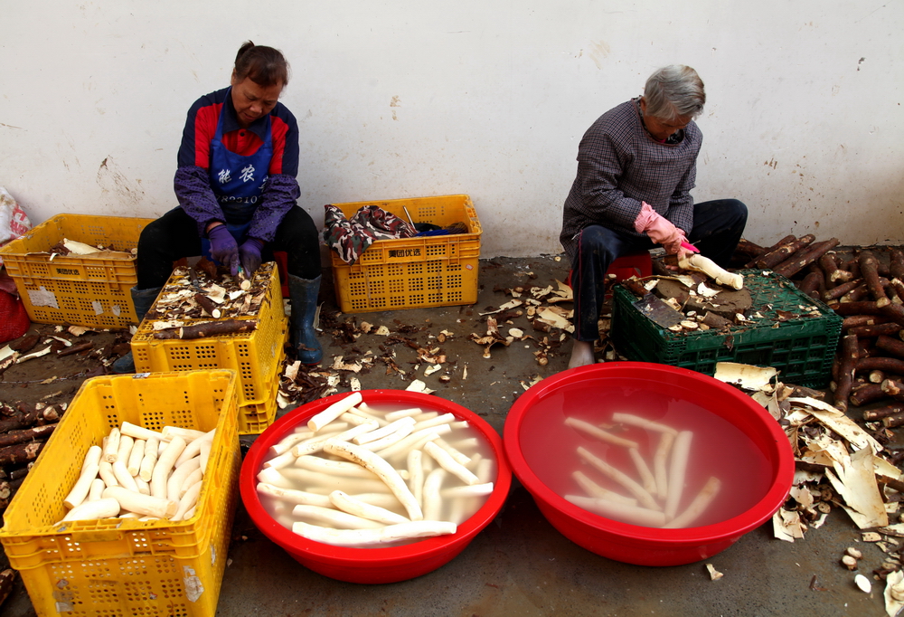 初冬时节,广西来宾市忻城县城关镇高塘村种植400亩的黄心木薯喜获丰收,当地农民抢抓晴好天气忙着抢收、脱皮、清洗、销售,田间地头一派忙碌景象。