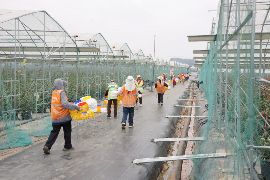 该基地占地面积约960亩,共建有现代化大棚约1200座,栽种蓝莓约36万株。经过600多箱蜜蜂授粉,基地的首批蓝莓已正式成熟上市,主要销往长三角、大湾区等市场。