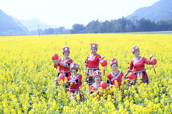 暖阳下,油菜花闪烁着金色光芒,微风拂过,花浪起伏,浓郁的花香扑鼻而来,令人心旷神怡。穿梭在油菜花海中的小径,许多游客被眼前的美景打动,纷纷拿出手机和相机。一位摄影爱好者兴奋地表示:“油菜花的金黄与喜庆的红色搭配在一起,色彩对比强烈,充满了视觉冲击力,这样的美景太美好了。”