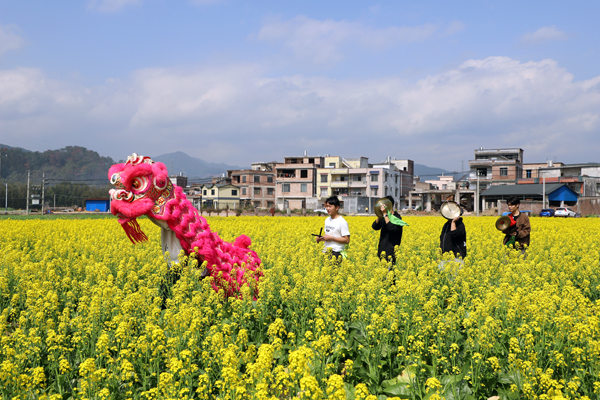 一群舞狮的少年从村边的花海路过。