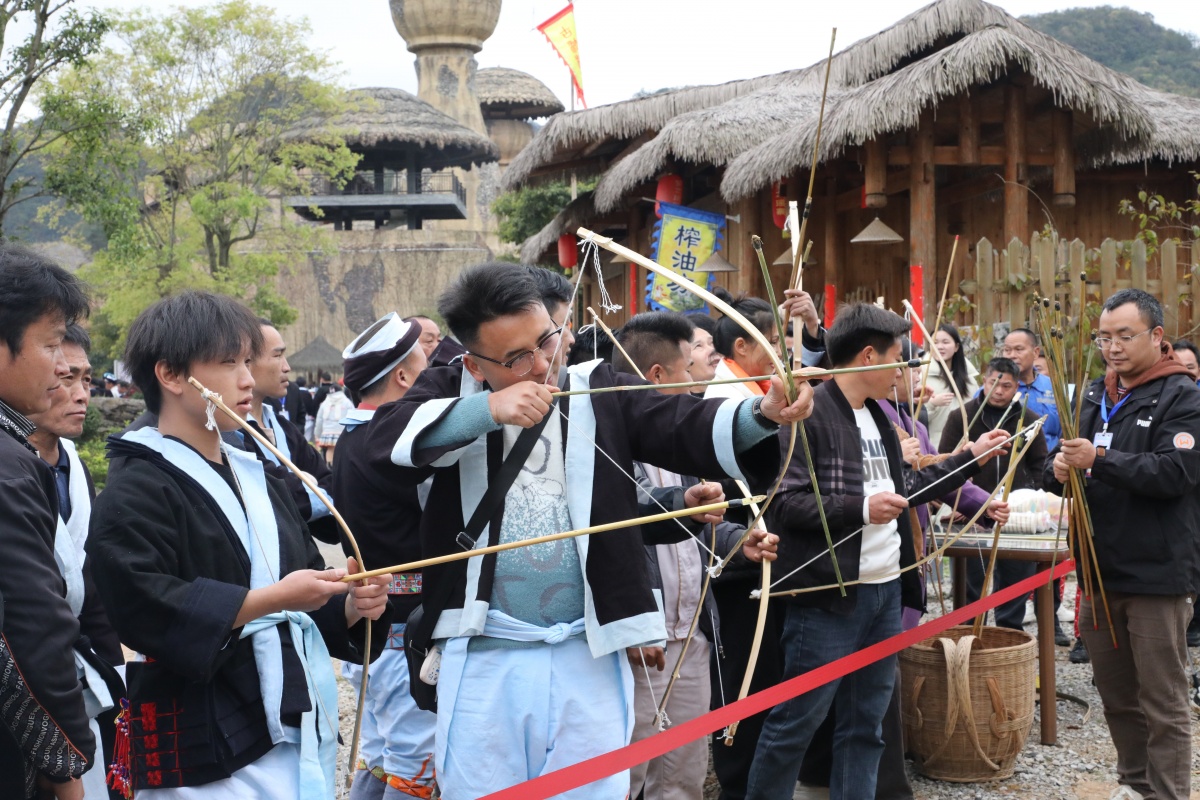 各活动场地的民俗竞技与互动体验,让现场氛围持续升温。陀螺场内,各村屯的参赛选手奋力挥鞭,陀螺飞速旋转,发出“嗡嗡”的声响,围观的游客们不时发出阵阵喝彩;斗蛋互动体验区充满童趣,大人小孩手持鸡蛋,小心翼翼地比拼,赢了的欢呼雀跃,输了的也笑意盈盈;弓弩互动体验区排起长队,大家瞄准靶心,拉弓搭箭,体验射箭的乐趣……当天,共有陀螺、斗鸡、打铜鼓、吃长席宴、唱细话歌等8项传统体育竞技与民俗活动。