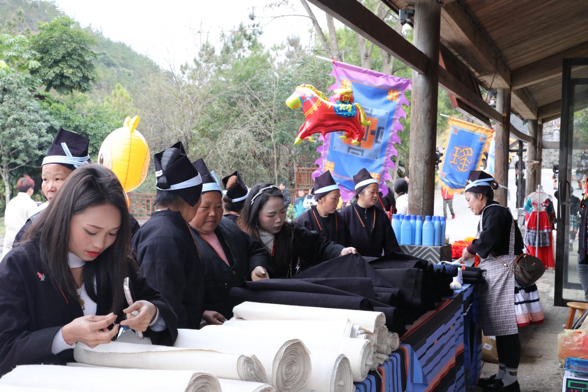 白裤瑶妇女在挑选布料。