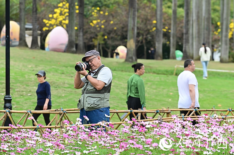 摄影爱好者在南宁市江南公园拍摄格桑花。人民网记者 雷琦竣摄