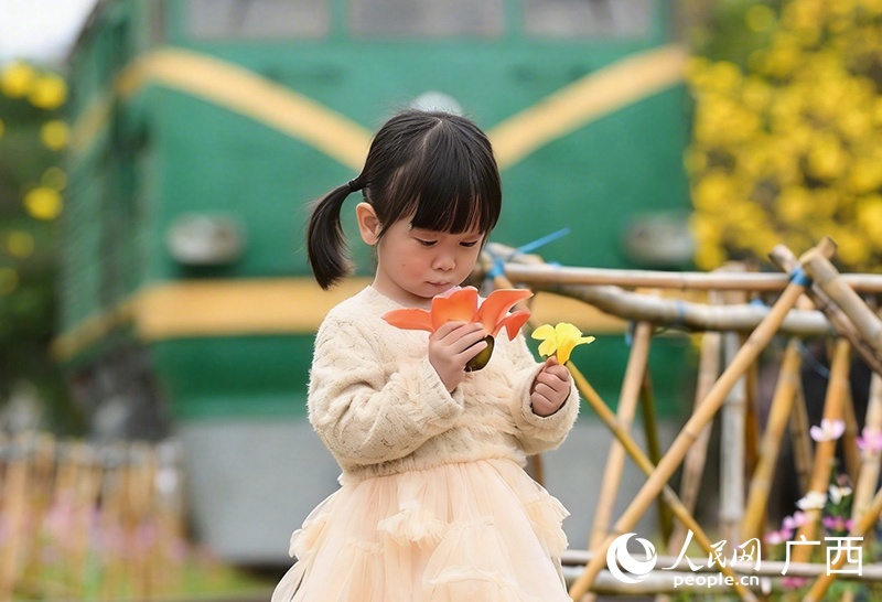 小朋友在南宁市江南公园拾起落在地上的花朵。人民网记者 雷琦竣摄