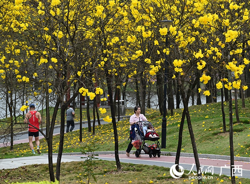 南宁市江南公园,市民在黄花风铃花下散步。人民网记者 雷琦竣摄