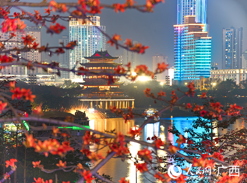 夜晚的木棉花与南宁夜景相映成趣。人民网记者 雷琦竣摄
