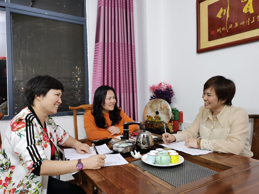 韦柳萍(右一)与合伙生意的姐妹研究工作