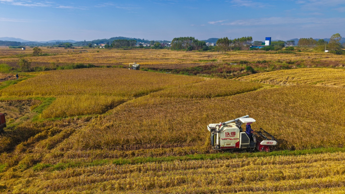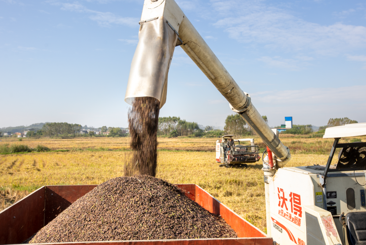 在象州粒粒香优质水稻种植专业合作社的黑香糯稻田里,沉甸甸的稻穗压弯了稻秆,两台收割机在田间轰鸣穿梭,社员们抢抓晴好天气加紧收割。合作社社员莫秋良介绍,合作社今年共种植780 亩水稻,品种以红米、黑米、丝香米为主,此次收获的20 亩黑香糯是专门对接广东客户的订单种植品种,以每斤谷子3元价格销售。