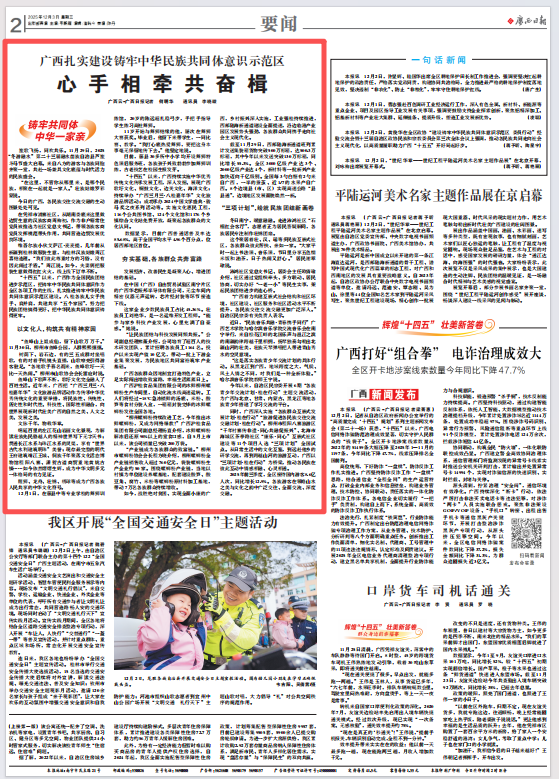 “十四五”以来,广西作为全国民族团结进步示范区,把铸牢中华民族共同体意识作为全区各项工作的主线,扎实推进铸牢中华民族共同体意识示范区建设。八桂各族儿女手挽手、肩并肩,共建共享“五个家园”,努力把民族团结搞得更好、把中华民族共同体意识铸得更牢。