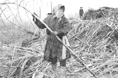 ▲ 妇女们正在冒雨砍收甘蔗 。